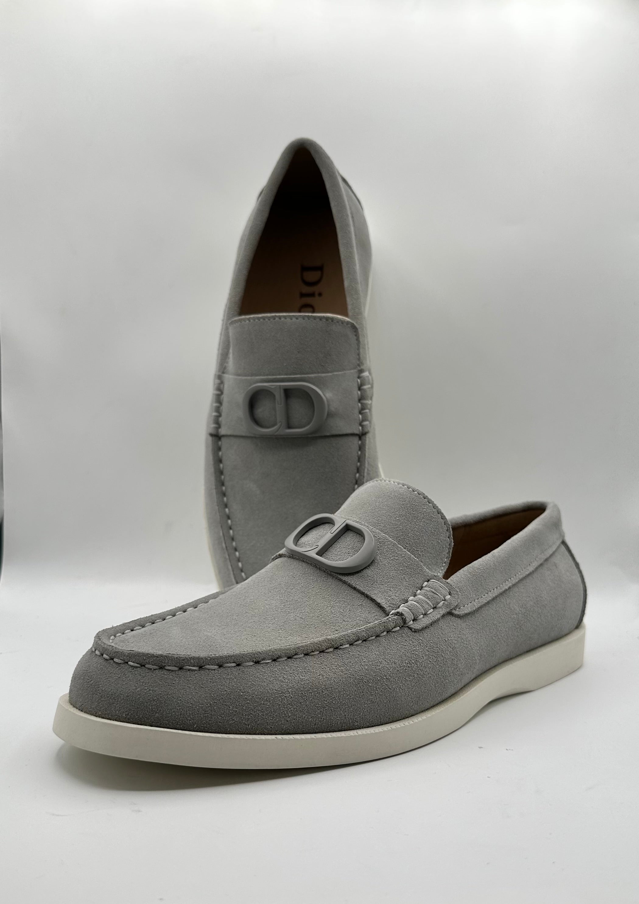 Elevate your footwear collection with these Dior inspired luxury loafers, the epitome of refined European style. Meticulously crafted from premium soft-touch suede, these loafers are available in two sophisticated colorways: a classic sand beige and a modern slate grey. Each pair features the iconic tonal "CD" metal emblem across the saddle strap, offering a subtle yet recognizable designer touch. Designed for ultimate comfort, these Dior style moccasins are built on a lightweight, flexible contrast sole with reinforced hand-stitched detailing for long-lasting durability.