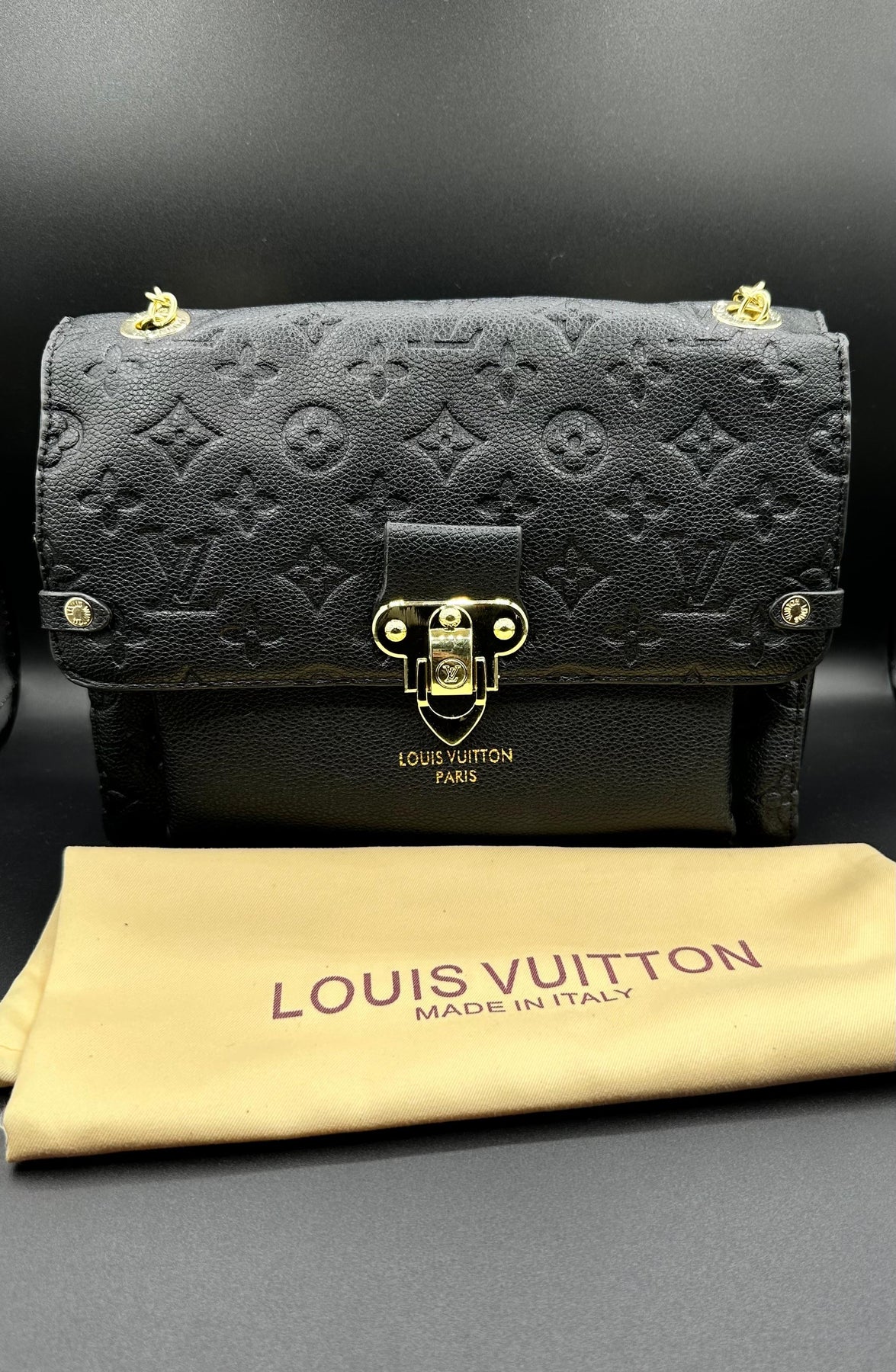 Command attention with the Louis Vuitton Vavin Shoulder Bag in classic Midnight Black, masterfully crafted from supple Empreinte leather with a deep embossed monogram pattern. This sophisticated noir piece features a signature gold-tone lock and a versatile sliding chain strap that transitions effortlessly from a formal shoulder bag to a modern crossbody