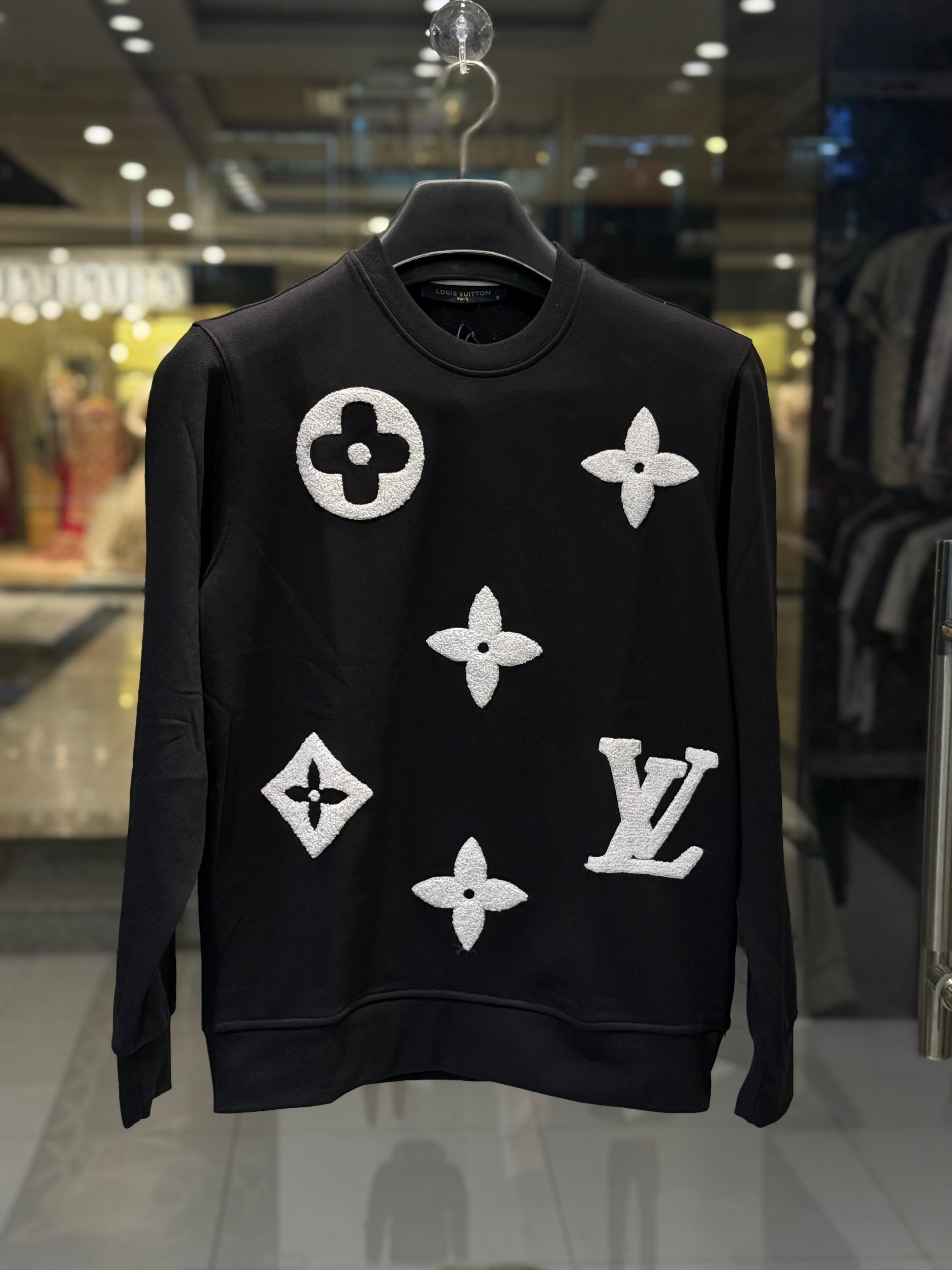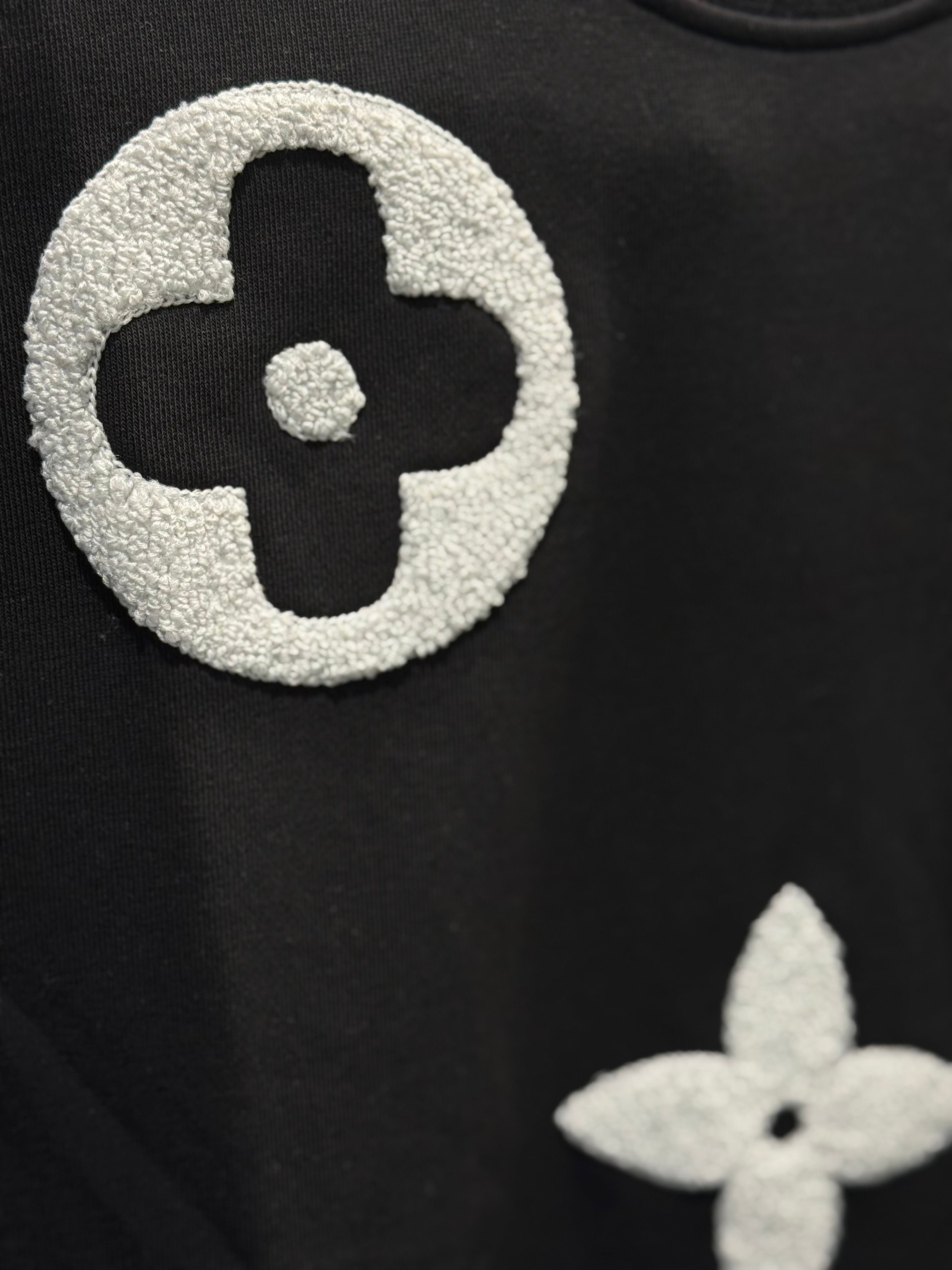 Redefine your urban style with this LV-inspired premium black sweatshirt, a perfect fusion of classic branding and modern texture. This standout piece features the iconic interlocking logo and monogram floral symbols, all rendered in raised white chenille patches for a luxurious 3D effect that you can actually feel. The solid black fabric serves as a high-contrast canvas, making the bold white graphics pop for a sharp, sophisticated look. Crafted from a high-quality, heavyweight cotton blend, this sweatshirt provides superior warmth and a soft interior, making it an essential for your winter wardrobe.