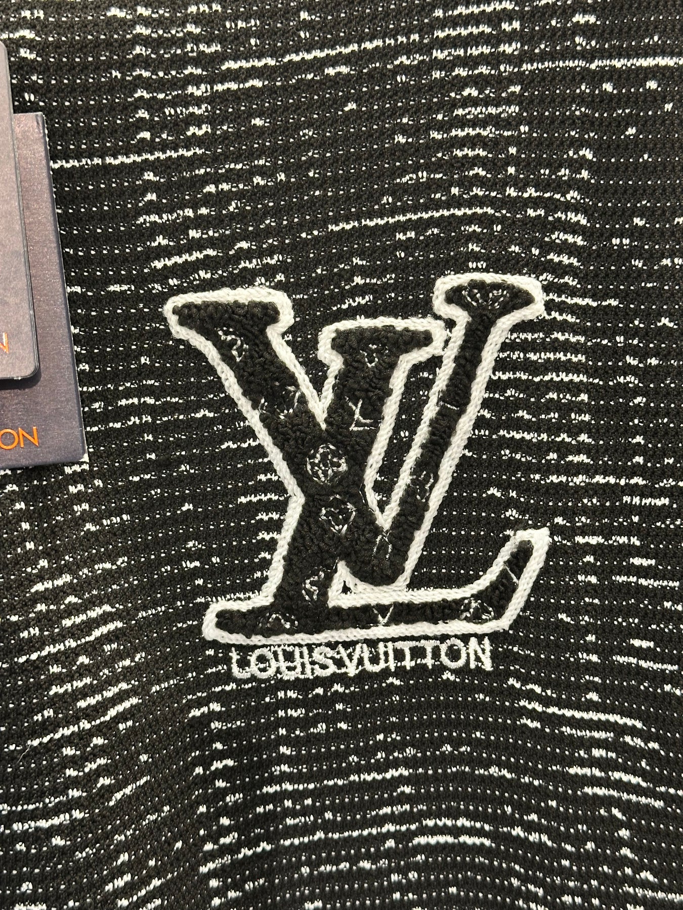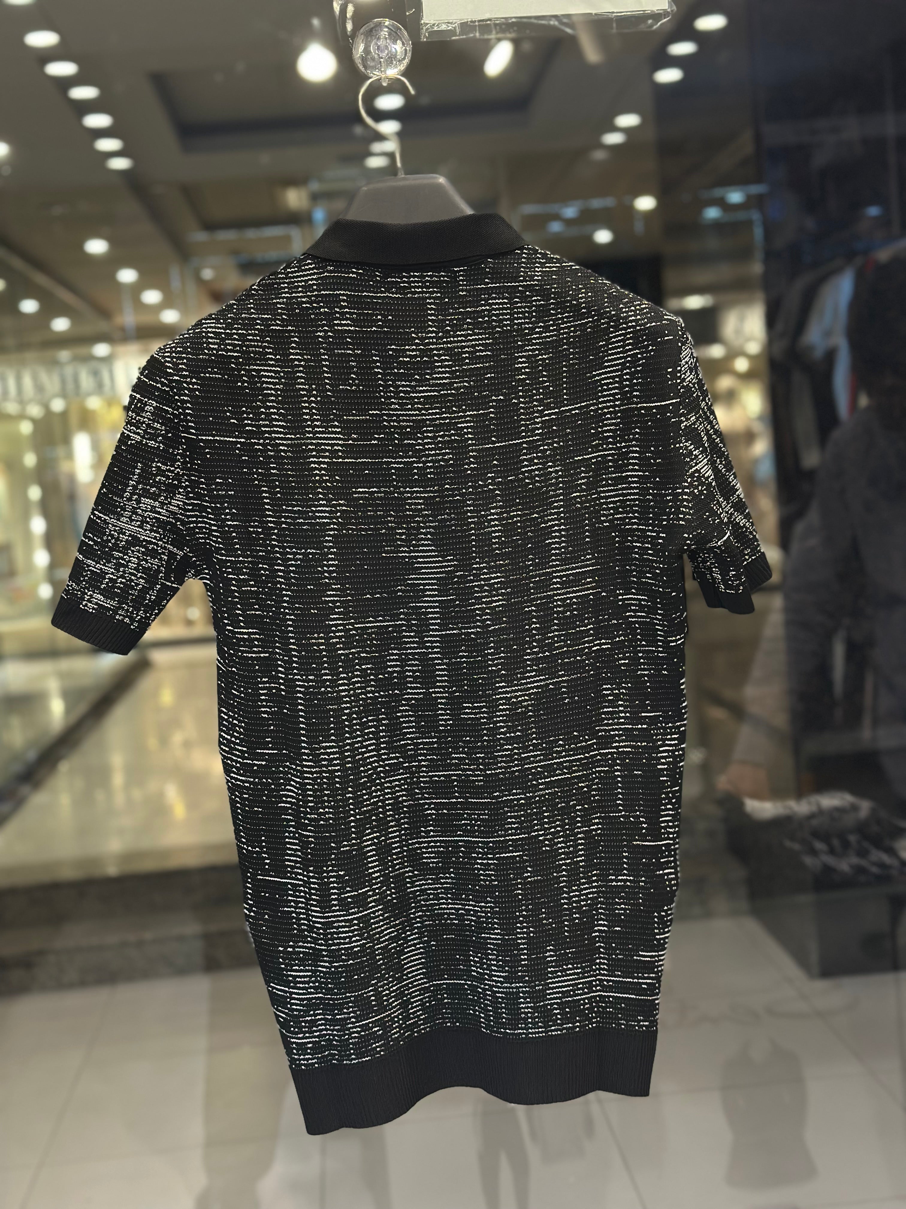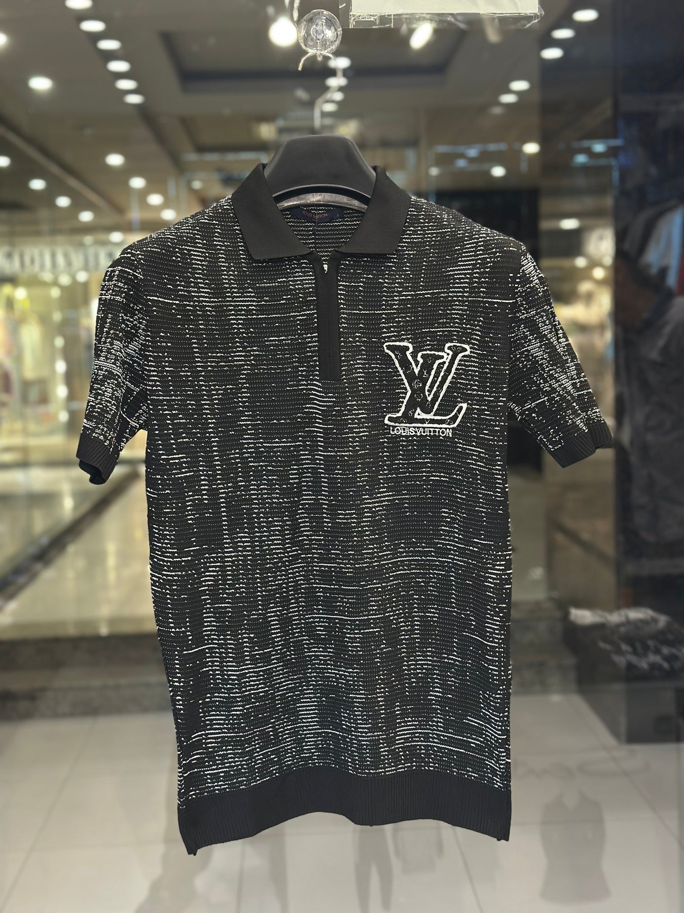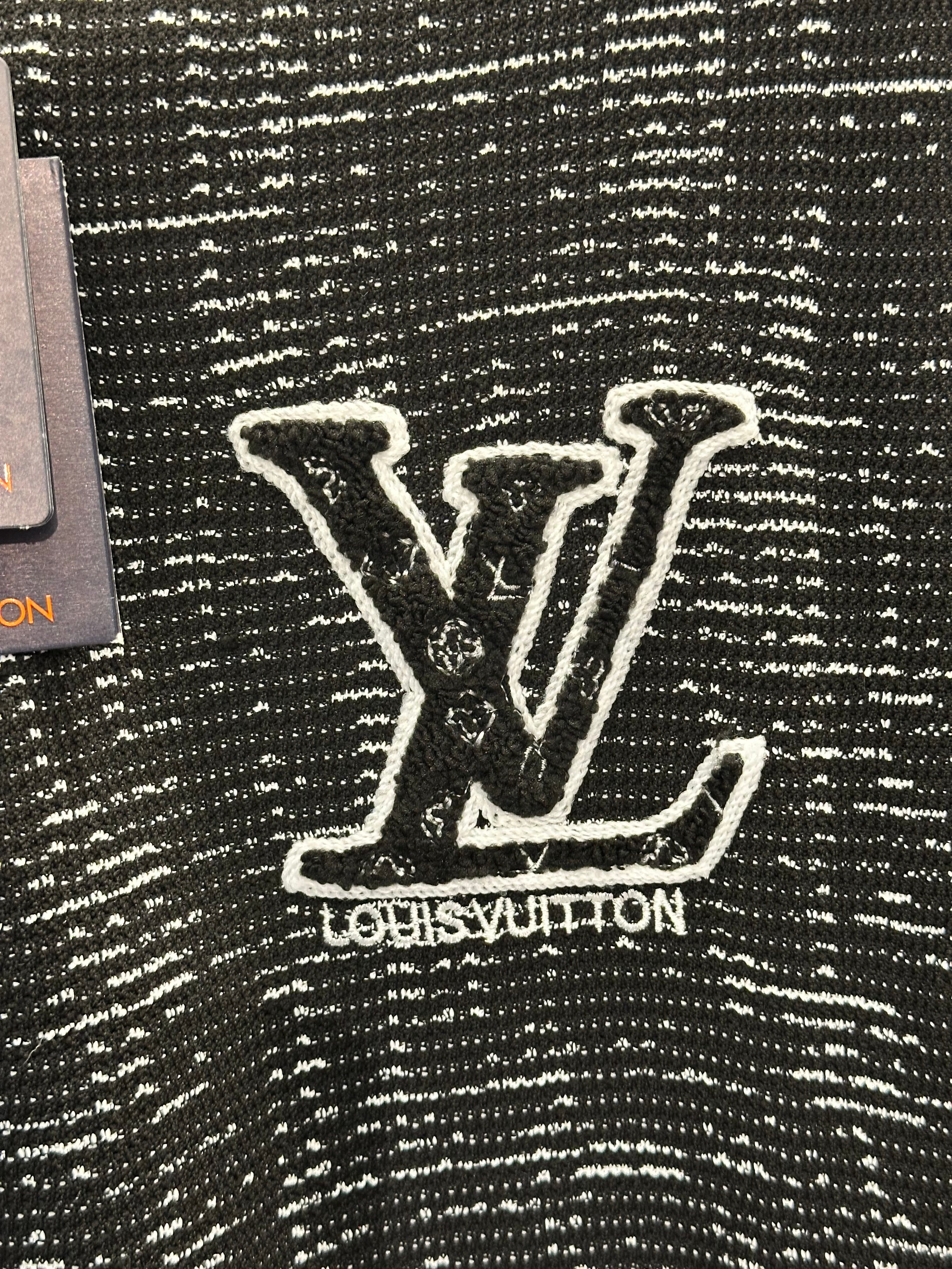 This premium Louis Vuitton polo shirt features a unique all-over abstract graphic pattern and a sophisticated quarter-zip neckline for a modern edge. Crafted from high-quality black knit fabric, the design is anchored by a large, artistically rendered white LV signature logo on the left chest. With its ribbed cuffs and clean hemline, this piece perfectly combines avant-garde aesthetics with classic luxury sport styling.