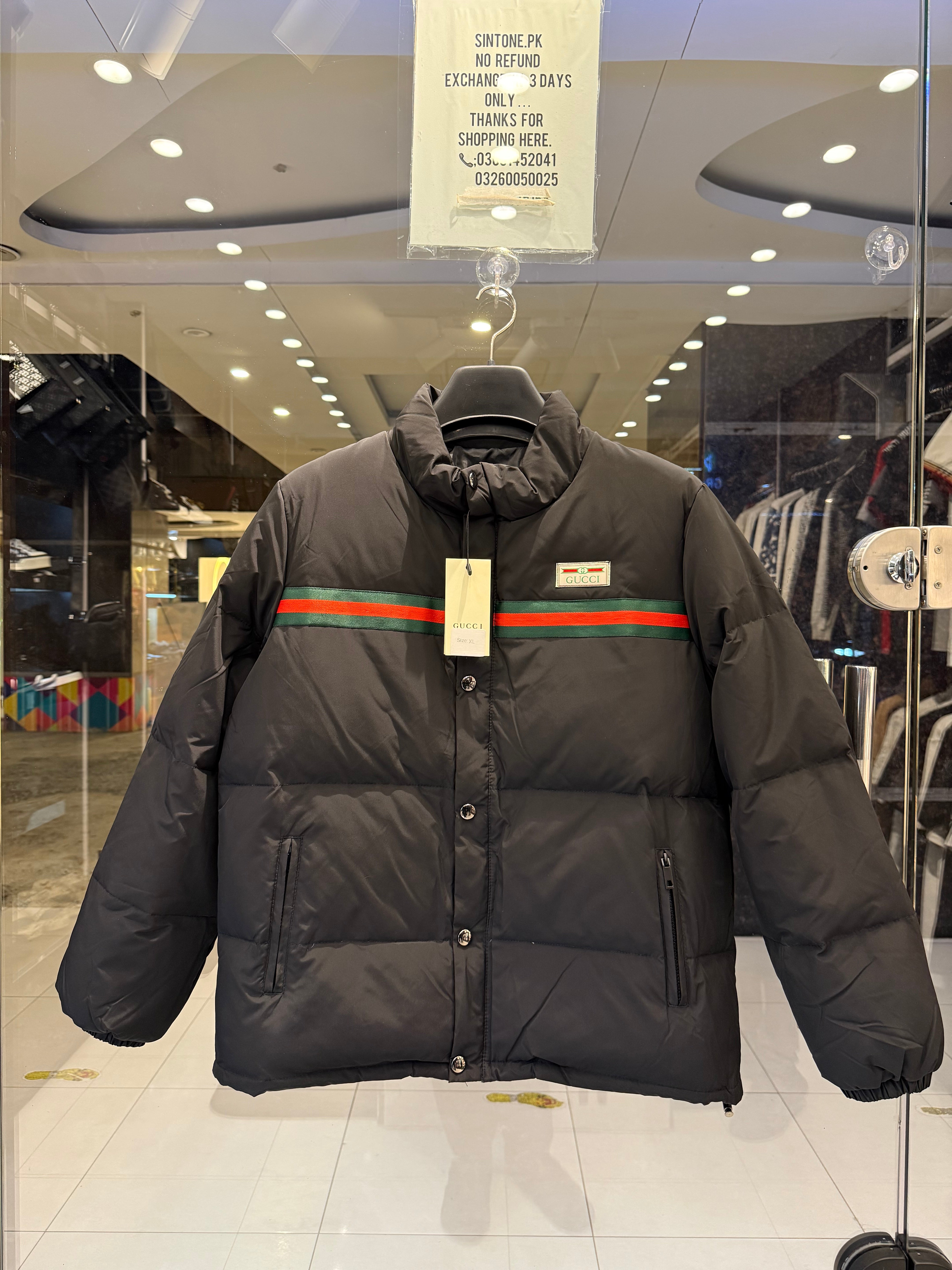 Redefine your winter style with this Premium Black Puffer Jacket, featuring the iconic green and red web stripe for a sophisticated, high-end look. Designed for those who appreciate luxury streetwear, this jacket offers a sleek matte finish and a structured quilted silhouette that ensures both comfort and warmth. The heavy-duty insulation provides excellent protection against cold weather, while the lightweight construction allows for easy movement.